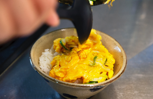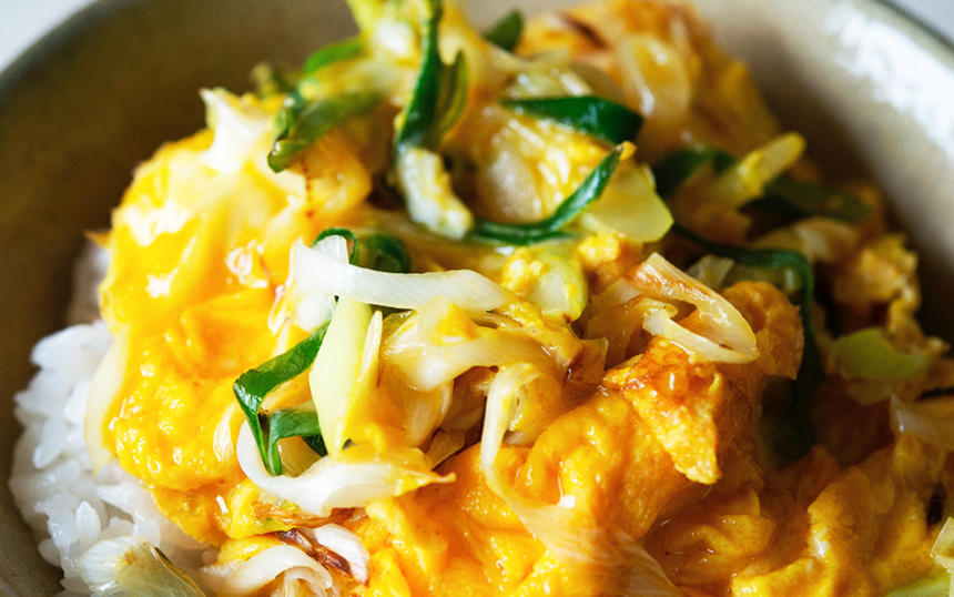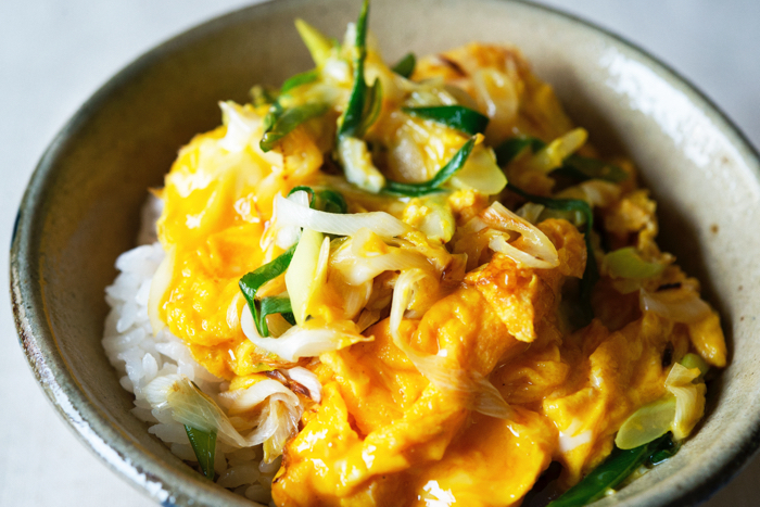 一方の長ネギは、中弱火でじっくりと火を入れて、とろとろの食感と甘みを引き出していきます。あとは半熟卵と炒めた長ネギをフライパンでざっと合わせてアツアツごはんの上へのせていただきます。