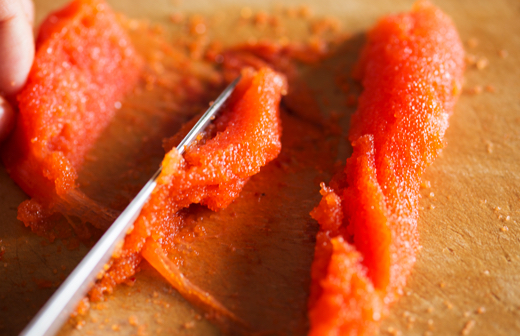 1.明太子に縦に切り込みを入れ、腹から身をこそげ出す。
