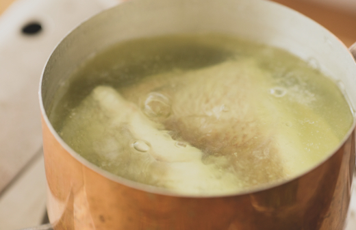 水にとって冷まし、水気を絞る。同じ湯で鯛の切り身を2~3分ゆで、火が通ったらひきあげて粗熱をとる。