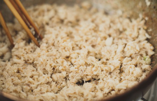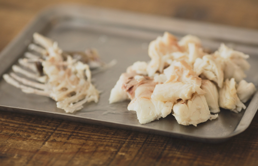 3.2の鯛の皮と骨を取り除いて、手で粗くほぐす。(鯛の小骨は指先を使って注意深く探し、すべて取り除く)