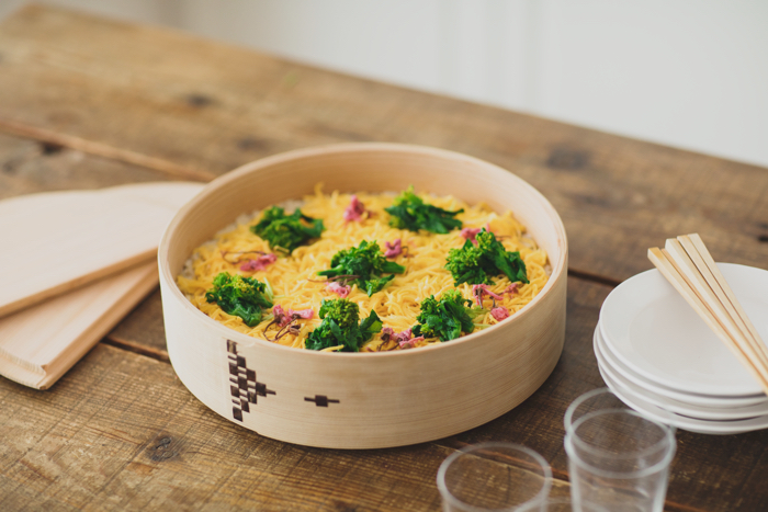 飯台(飯切)は、秋田の「柴田慶信商店」のものを愛用しています。今回のようにちらし寿司はもちろん、夏には冷やしうどんや冷や麦を入れたり、秋には炊き込みご飯を盛りつけたりと、季節を問わず使っています。おにぎりとおかずを詰め合わせ、クロスで包んでそのままピクニックに持っていくことも。一つあるとすごく便利な道具です。