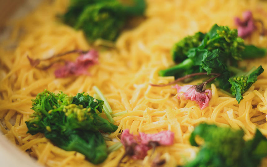 春らしく、旬の鯛を使ってそぼろを作り、錦糸卵を敷き詰めたら、彩りとして菜の花や三つ葉、桜の塩漬けを散らすだけ。