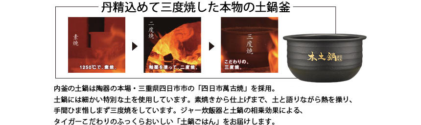 乾燥と焼成を3回繰り返して作る焼き物の製法。土鍋圧力IHジャー炊飯器〈炊きたて〉土鍋ご泡火(ほうび)炊き JPL-G100などに搭載されている本土鍋の焼き方。