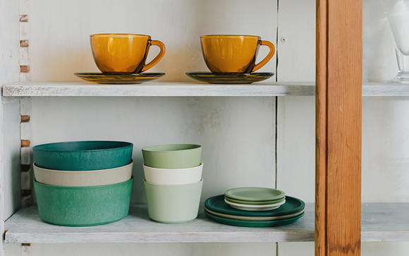 まるで作家ものの陶器のような、温かなカラーリングと丸みのあるフォルムが印象的な〈9°〉。自然豊かな富山県白馬岳の麓の工場で作られているこちらのアイテムは、雪と大地と緑を想起させる6色を用意。サイズは、スープやお茶などに最適な「U 90」と、おかずや丼ものに最適な「U150」の、毎日の食卓で活躍する2サイズを展開しています。