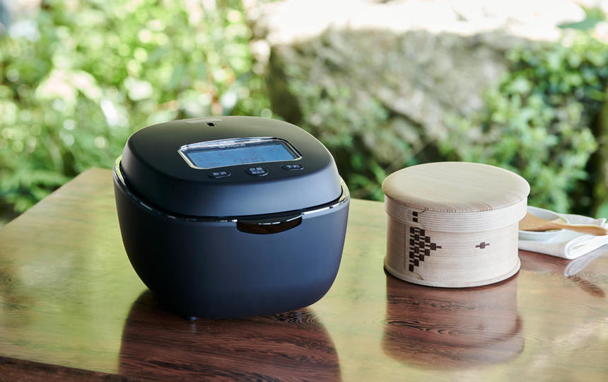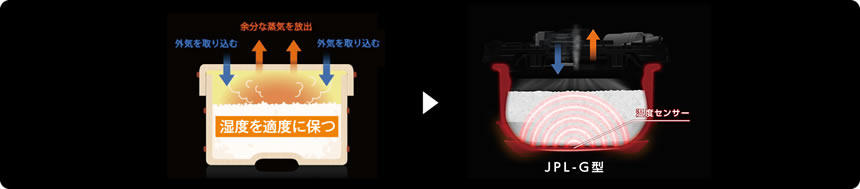外気を取り込み余分な熱と蒸気を放出する”呼吸”で、空気と水分を上手にコントロールし、おいしく保温する仕組み。木製のおひつをお手本にした構造。