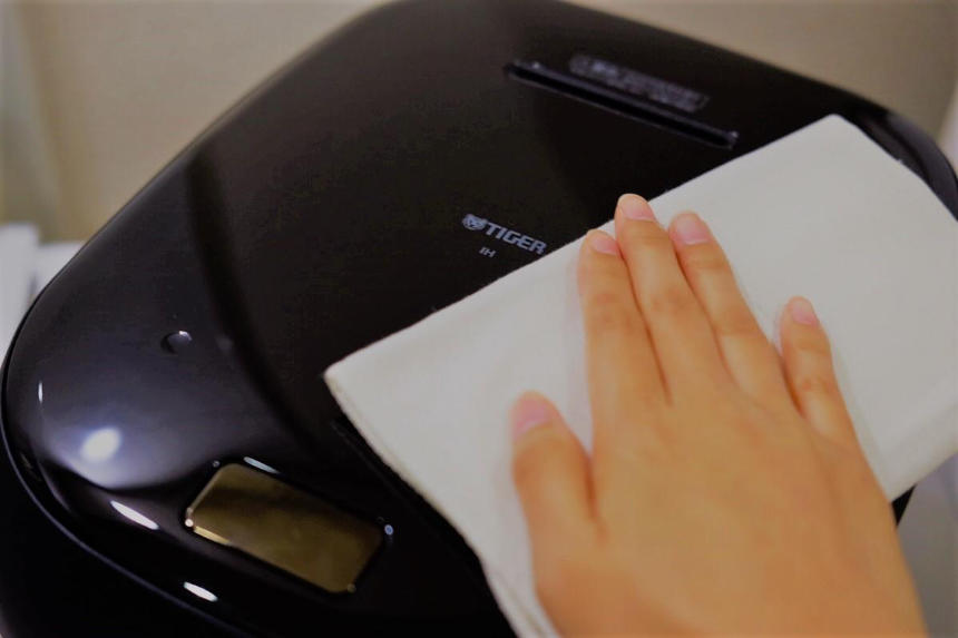 本体は、水で濡らしてかたくしぼった布でふきます。ストッパー部、フック部、ふたパッキンなどにごはん粒がついている場合は、取り除いてください。ふたにセンサーがついているタイプの炊飯器の場合、センサー部分を布や綿棒などで軽く水ぶきします。