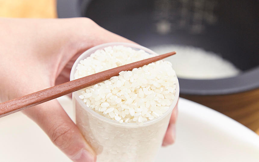 お米の量が安定しないと、炊き上がりが上手くいかなかったり、底面が焦げすぎたりすることがありますが、付属の計量カップを使い、すりきりすることで、それを防ぐことができます。
