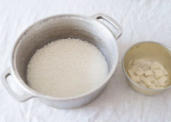 使うのはいつも食べているお米と切り餅。普段どおり研いで浸水させたお米に小さく切ったお餅を混ぜて炊くだけです。