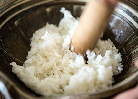 炊き上がったごはんはすり鉢に入れてお好みの食感になるまでこねます。ごはんの粒をほとんどつぶすと、もちもちとお餅に近い食感に。