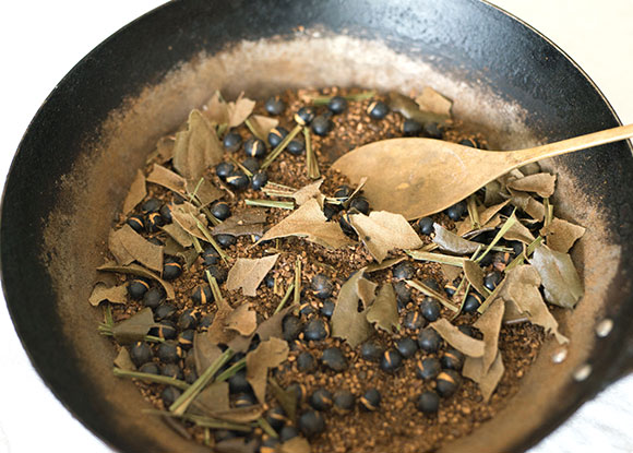 黒豆や小豆、香りのいい香草を加えて弱火に。豆の皮がはじけ、香りが立ってきたら火を止めます。