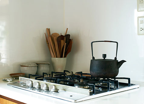 でき上がったのはシンプルな空間。スペースはコンパクトですが、手の届く範囲に必要なものが収められ、きれいに拭き上げられたカウンターの上はすっきり。「自分が台所に合わせていく」という飛田さんが、実際に使いながら工夫し、整えた舞台では、流れるように料理が生まれていきます。
