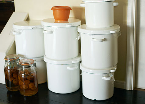 ホーロー容器は1つがアンチョビ、残りは梅の仕込み中。梅干しと甘いぽたぽた梅、梅シロップを毎年作っている。