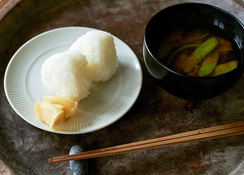 炊きたてのごはんをおひつに移し、熱々のうちに手に塩をつけて小ぶりに握った塩むすび。出汁のきいた自家製味噌のお味噌汁。白いごはんが大好きだという飛田家は、これにちょっとした常備菜があれば大満足なのだそう。