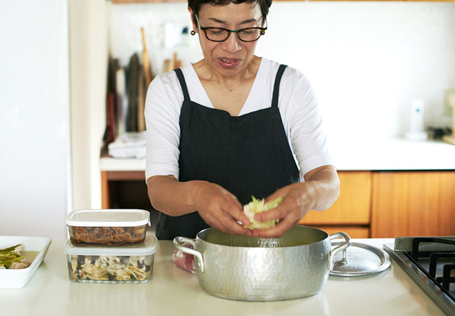 「娘のお弁当にキュウリを1/2本入れたら、残りを千切りにして塩をしておくとか、ついでにちょっとだけでも進めておきます。味まで決めておかずにしておくこともあるけれど、野菜を切るだけ、豚肉に塩を振るだけでもいいの。仕事が終わった後で全部イチから作りはじめるのは大変です。そんなものが少し冷蔵庫にあるだけで、すごく助けになるなと思うんです」