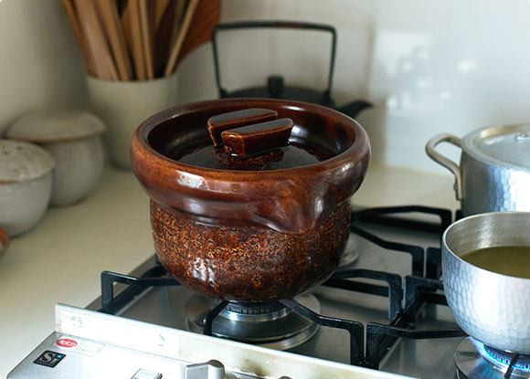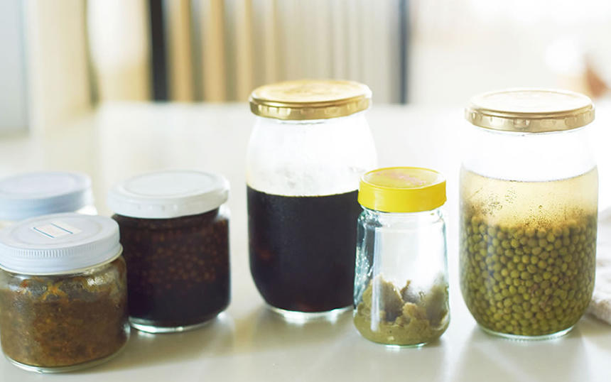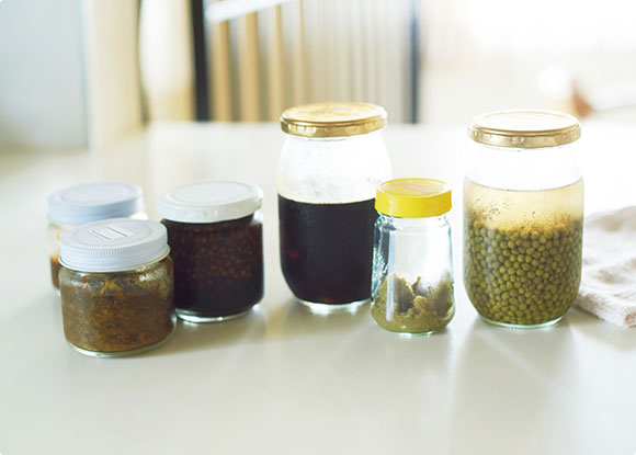 普段のごはん作りとは別に、飛田さんが続けているのが、季節ごとにいろいろな保存食を作ること。台所をのぞくと、廊下には梅干しやアンチョビを仕込んだホーロー容器が並び、冷蔵庫の中には手作りの調味料がいろいろ。毎日の食卓を豊かにしているのが、このおいしい自家製たちです。