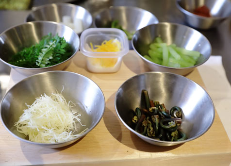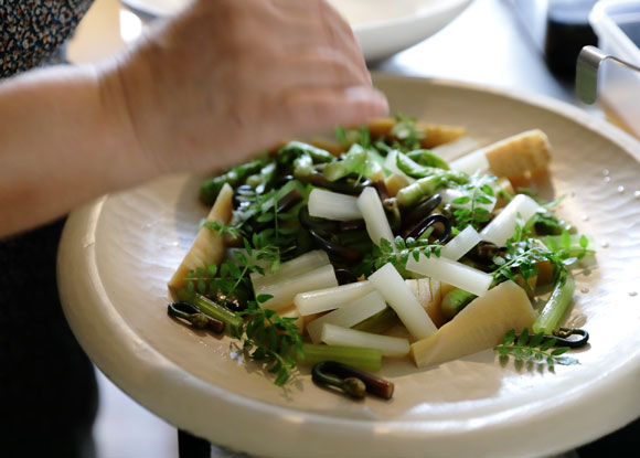 食材をよく見て、下ごしらえをきちんとしておくことです。例えば、今回はフキやワラビはそれぞれ茹でたり煮たりしてあります。この後に、混ぜて盛り付けますが、別々に下ごしらえしたものだからこそ、それぞれの食感も良く、色も鮮やかにきれいに仕上がると思うんです。
