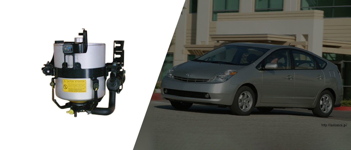 株式会社デンソー様との共同開発。トヨタ自動車株式会社様が開発した世界初となる自動車用エンジン冷却水の蓄熱システムを、北米市場向けハイブリッドカー「プリウス」(2004年モデル)に採用されました。走行時に温かいエンジン冷却水を真空タンク内に蓄えておき、エンジン再始動時に効率よく供給し素早く最適温度まで上昇させます。