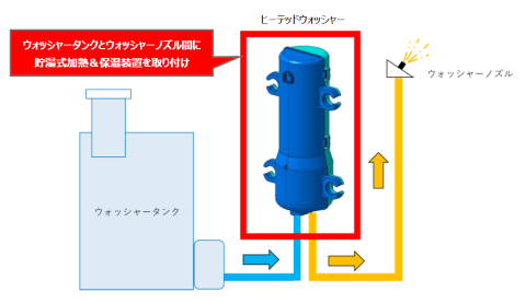 ウォッシャータンクとウォッシャーノズルの間に、真空断熱容器とヒーター構造を備えた装置『ヒーテッドウォッシャー』を設置。