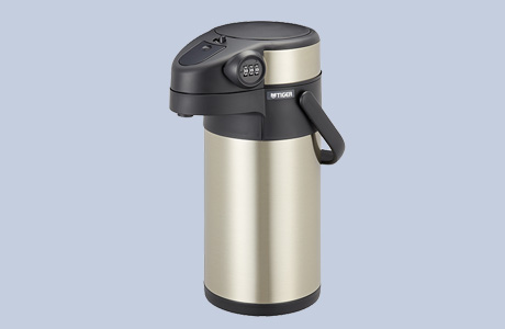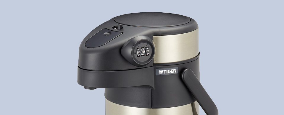 列車内販売用のステンレスエアーポットとして開発。列車内を行き来する間に、抽出したての熱いコーヒーが冷めてしまわないよう、真空2重構造による断熱効果で保温性を高めました。また往来の多い車内での使用を考えて、ふた部分に鍵を付けて安全性を高めました。2017年9月、ふたロックを鍵からダイヤル式に改良。