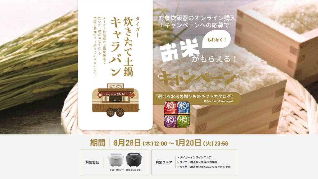 キャンペーン期間中、タイガーオンラインストア、タイガー魔法瓶 公式ストア(楽天・Yahoo!)にて、対象の土鍋圧力IHジャー炊飯器「JRX-S060」または「JRX-S100」をご購入のうえ、キャンペーンにご応募いただいた方全員に、デジタルカタログギフト『選べるお米の贈りものギフトカタログ』をプレゼントいたします。