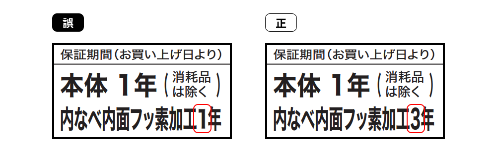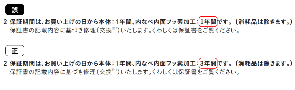 上記の記載間違いにつきましては、今後製造する製品より正しい表示に切り替えを致します。 また、既にご購入のお客様につきましても、内なべ内面フッ素加工は3年保証でご対応させていただきます。なお、本製品の性能、品質には全く問題ございません。