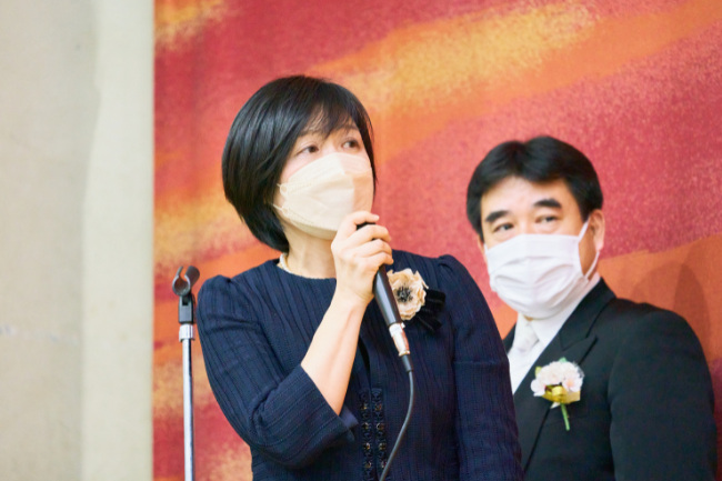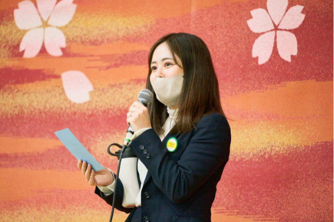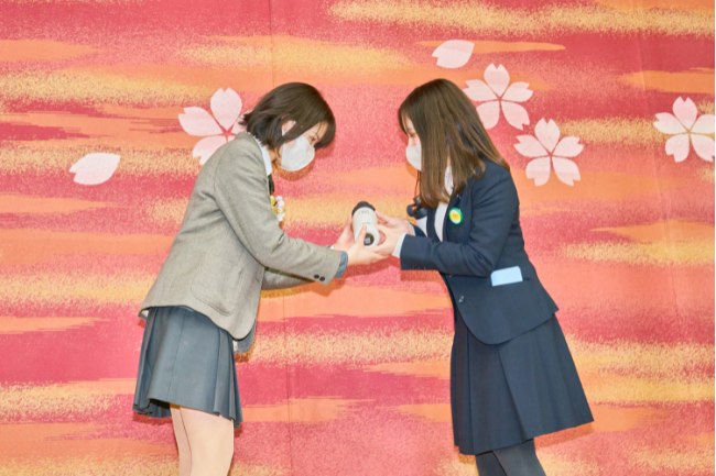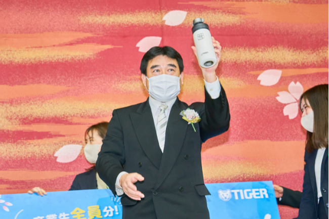 その後、タイガー魔法瓶の広報担当者が、舞台上で卒業生代表の生徒にオリジナルデザインのタイガーボトルを贈呈。生徒会を務めていた卒業生は「コロナ禍で始まった高校生活、辛いこともありましたが、今思うととても充実した3年間でした。皆ばらばらになってしまうけど、この魔法瓶を使って、大学生活を楽しみたいと思います。普通の高校生が行う行事を制限なしでできたのが卒業式が初めてで、とても思い入れのある嬉しいイベントに、使う度に青春のひとときを思い出せるような魔法瓶のプレゼントをいただけて感謝の気持ちでいっぱいです。」と思いの丈を語りました。