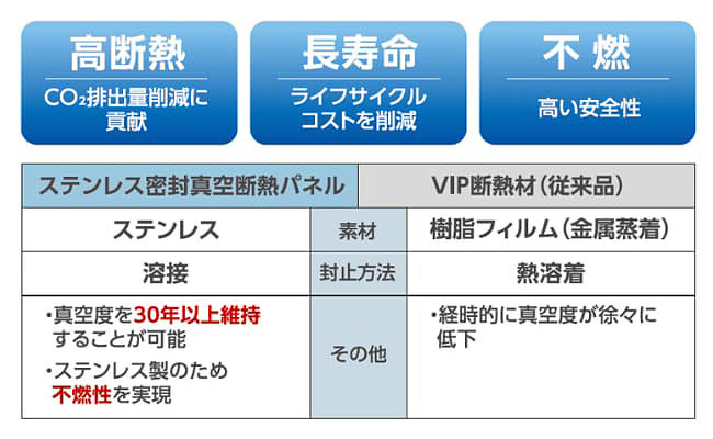 さらに、ステンレス素材を使用して、魔法瓶の真空断熱技術をパネル化することで、従来の真空断熱材では得られなかった不燃性と高断熱性の長期間維持が可能に。