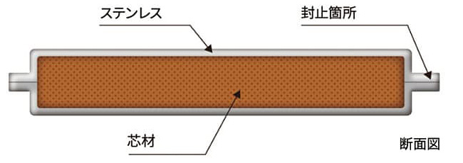 二重にしたステンレス箔の内側を真空状態にし、断熱性能を高めた素材です。さらに、形状を保つために芯材となる素材を中に入れて封止しています。