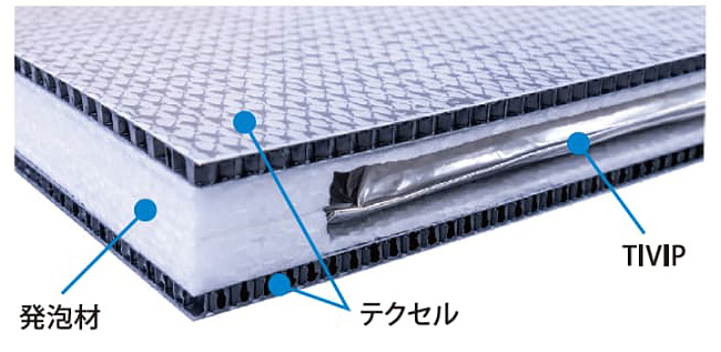 大阪・関西万博内での活用においては、当社が新開発したステンレス密封真空断熱パネル「TIVIP」を岐阜プラスチック工業の軽量・高強度素材である樹脂製ハニカムパネル「テクセル」でサンドイッチすることで、 TIVIPを保護し軽量かつ強固な断熱ユニットパネルとなっております。