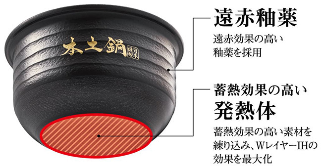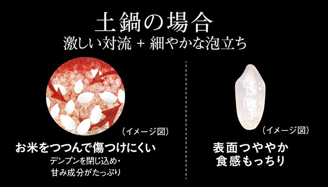 さらに、土鍋だからこそできる、金属鍋と比べて約4倍※4の遠赤効果でお米を芯までじっくり加熱して旨みを引き出します。