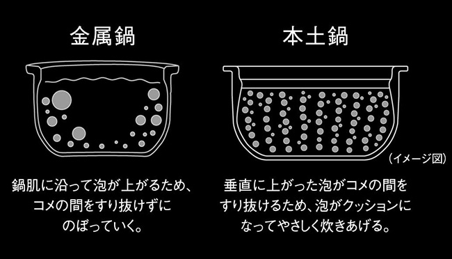 激しい対流の中ではお米の表面が傷ついて、べたついた食感になったり、傷ついたお米の表皮からデンプンが流れ出て、ごはんの旨みが低減される原因になりますが、「ご泡火炊き」では、土鍋の表面から生み出される、土鍋ならではの細かくやさしい泡立ちでごはんを炊きあげます。