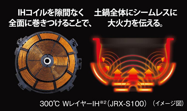 ※2 JRX-S100において「白米・標準」メニュー4合、炊きわけ「しゃっきり」、火かげん「強」炊飯時。内なべ外側底面の温度(当社調べ)。
