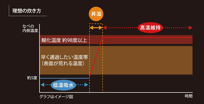 お米は急激に吸水させると表面が荒れ、甘みと食感が損なわれてしまうため、低温でじっくりと吸水させることが理想です。「極・低温吸水メニュー」では、吸水工程を省き、低温から一気に高火力で炊きあげることでベタつきを抑えつつ、昇温温度を巧みにコントロールすることで焦がさずに丁寧に炊き上げます。より深い甘みと食感を追求するプロ推薦の炊き方を実現します。