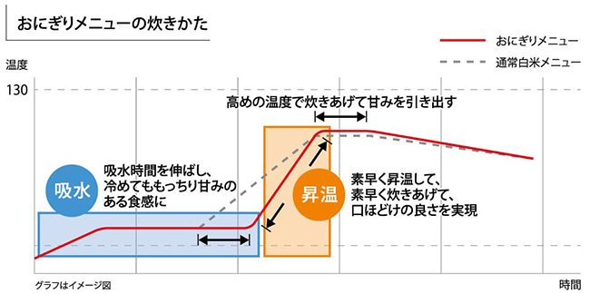 おにぎりに最適な温度コントロールで、土鍋ごはんで炊いたおにぎりの「粒感があり、ほどけるような食感」を目指して、新たにプログラムを開発・搭載しています。