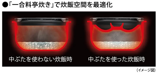 通常の炊飯器で1合を炊飯すると、炊飯空間が大きくなりすぎてお米一粒ひと粒に熱が均等に伝わりにくくなります。「一合料亭炊き」では専用の土鍋中ぶたを用いて炊飯空間を小さくすることで、お米に熱を均等に伝え、香り高く、甘みのあるごはんに仕上げます。お茶碗一膳(0.5合)にも炊込みごはんにも対応し、一流料亭のような炊きたてごはんをおいしく召しあがっていただけます。