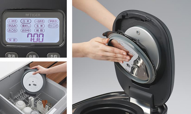「大型ホワイトバックライト液晶」は画面も文字も大きなタッチパネルで操作がラクラク。お手入れ点数は、内なべと内ぶたのみのたったの2点。部品の取り外しも簡単です。