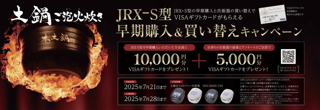 「土鍋ご泡火炊きJRX-S100/S060」の発売を記念して、「JRX-S型発売記念早期購入&買い替えキャンペーン」を期間限定で展開いたします。応募条件を満たした方には、最大15,000円相当のVISAギフトカードを応募者全員にプレゼントいたします。いち早く最新製品を手に入れたい方、炊飯器の買い替えで“得”をしたい方にピッタリなキャンペーンです。是非ともこの機会にご応募ください。
