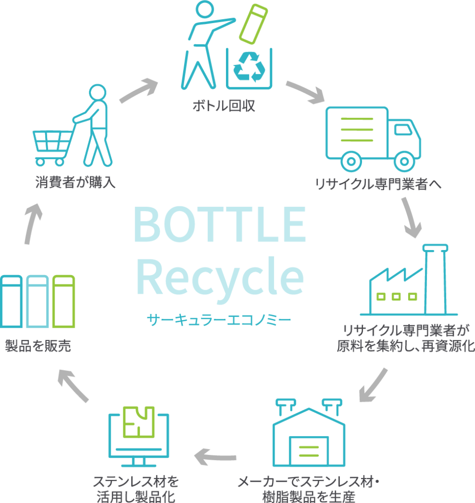 これまでステンレス製ボトルがご家庭から廃棄された場合、回収後の分別がリサイクル工程で大きな負担となっていました。この取り組みでは、素材がステンレスであることが明白なステンレス製ボトルを一定量まとめて回収することができます。そのため、リサイクル専門業者での再資源化の際に、従来の多種金属が混在した状態からステンレスを取り出す場合と比較して、作業の手間を省くことができます。また、不純物の混入が抑えられるので、純度の高いステンレス原料を確保することができます。