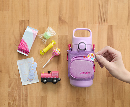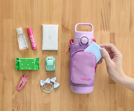 着脱可能なポーチにポケット機能を採用。お気に入りのおもちゃ、万が一のときの小さなケガにも安心なばんそうこう、お腹が空いたときのお菓子など、様々なアイテムを入れることができてお出かけに最適。ボトルを持つ楽しみが無限に広がり、お子さまの「ワクワク」を生み出します。