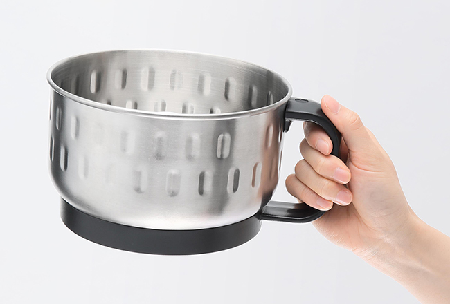 清潔に使える容量約600mL※の大容量カップは軽くて丈夫なステンレス製。ディンプル加工を施して食材が周囲にはりつきにくくなっています。