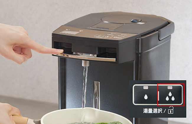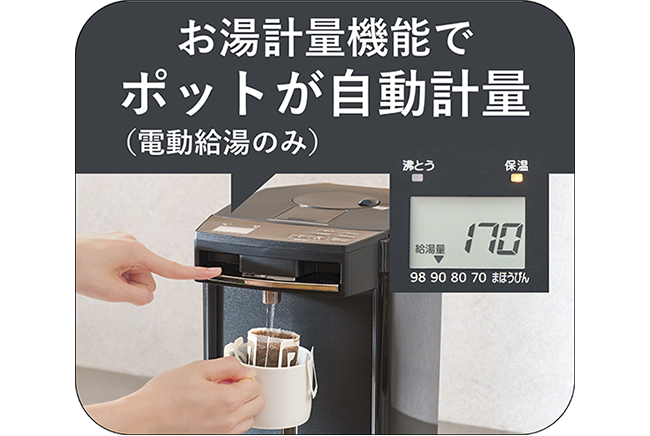 注いだ給湯量をポットが自動計量して液晶で表示してくれるので、お料理やインスタント調理に便利です。