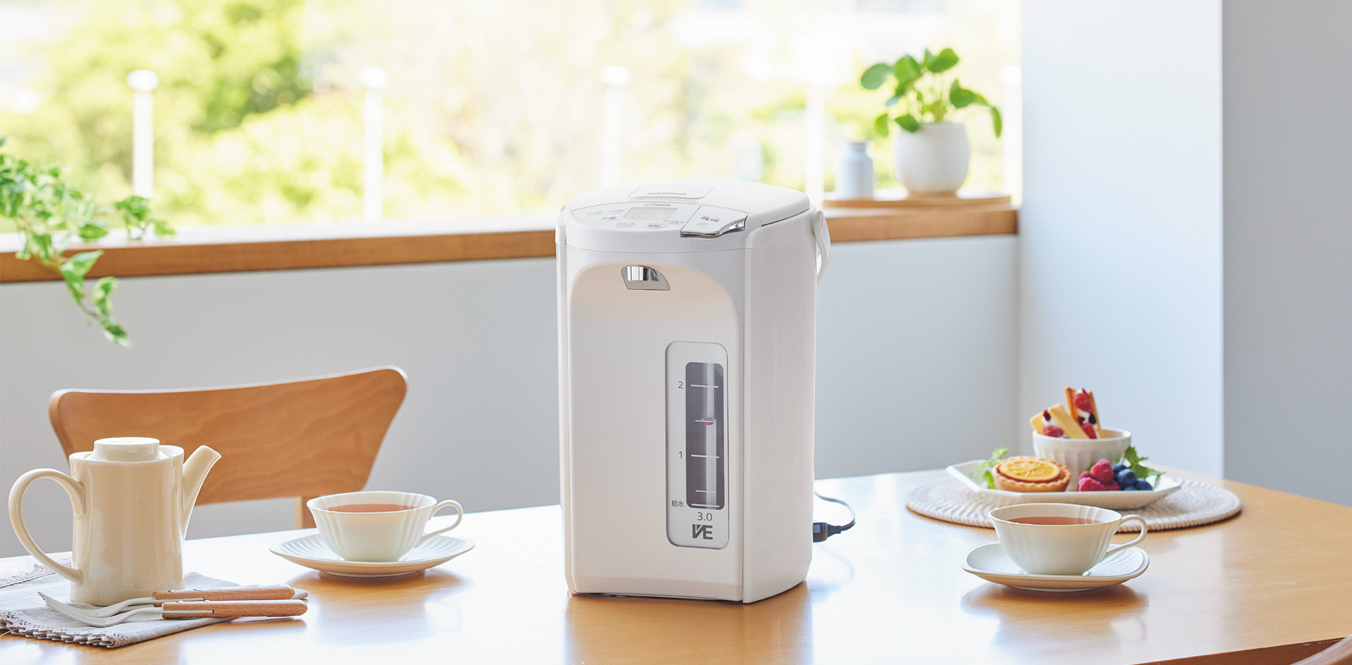 「蒸気キャッチャー構造*」搭載により、蒸気を水滴に変え、ポット内に戻す構造になっているため、蒸気を本体の外に出しません。うっかりと高温の蒸気にふれてやけどをするリスクを抑え、置き場所にも困りません。