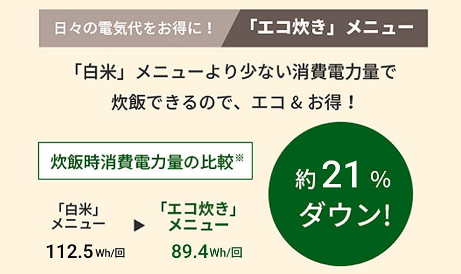 標準の「白米」メニューより少ない消費電力量で白米を炊くことができるので、電気代が気になる方にお勧めです。
