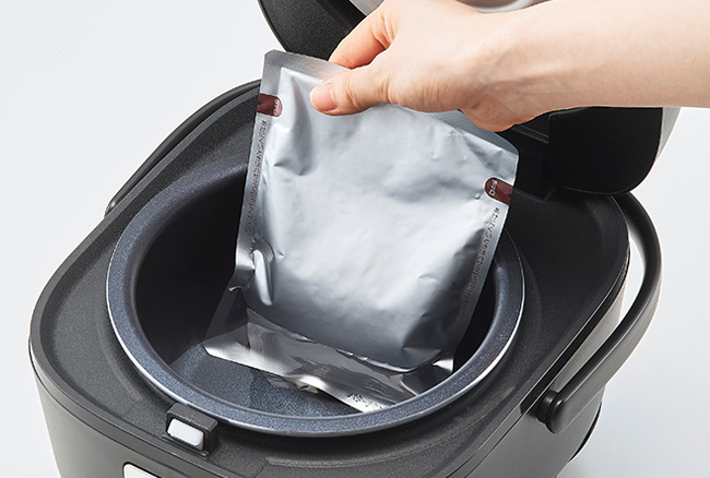 内なべに水とレトルトパックを入れて、「クッキング高温」メニューを選択。時間を設定して「炊飯」キーを押せば、ブザーが鳴るまでほったらかしで良いので、忙しいときにとっても便利。