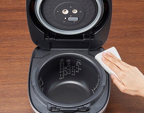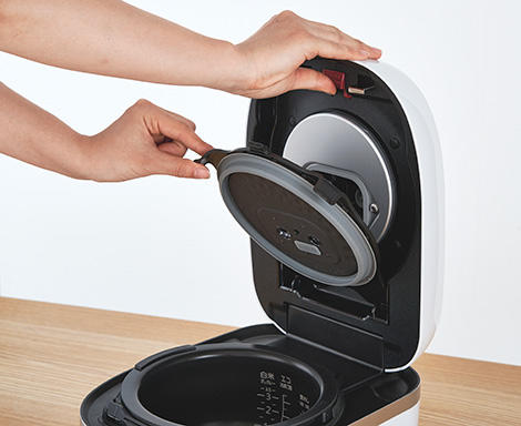 内ぶたには親水効果のある加工を採用。しずくになりにくく加熱時には素早く蒸発し不要な水分を取り除き、保温時には水分の膜を張ってごはんをしっとり保温します。水滴になりにくいので、つゆだれも防ぎます。