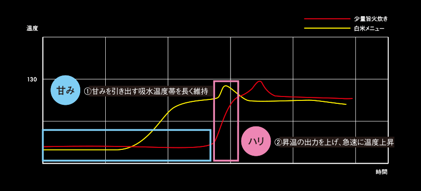 通常の「白米」メニューよりも甘みを引き出す吸水温度帯を長く持続させ、昇温時の火力を上げ急激に温度を上昇させることでハリのあるごはんに仕上げます。少量旨火炊きにより、かみごたえが約4%向上し、しっかり感のある炊きあがりに。