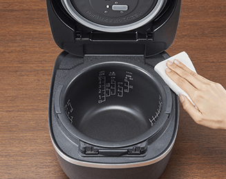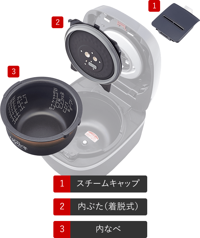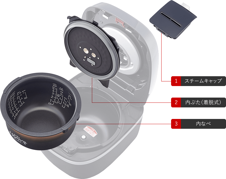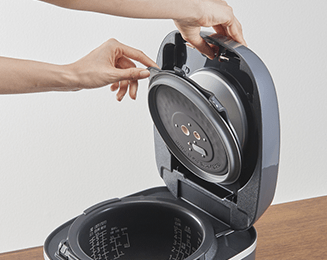 内ぶたには親水効果のある加工を採用。しずくになりにくく薄く膜を張ることで、加熱時には素早く蒸発し不要な水分を取り除き、保温時には水分の膜を張ってごはんをしっとり保温します。水滴になりにくいので、つゆだれも防ぎます。