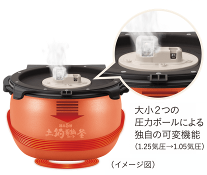 大小2つの圧カボールを制御し、ねばりを引き出ししっかり炊きあげます。炊きあげ時に1.25気圧の圧力をかけてねばりともちもちした弾力を引き出します。炊きあげ後は1.05気圧の高温蒸らしにより、ごはん粒を炊きしめ、べたつきをおさえたしっかりとしたごはん粒に仕あげます。