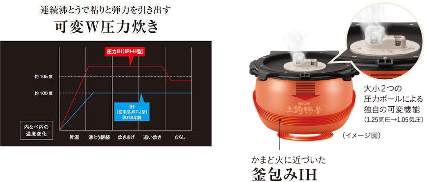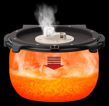 大小2つの圧カボールを制御し、ねばリを引き出ししっかり炊きあげます。炊きあげ時に約1.25気圧の圧力をかけてねばりともちもちした弾力を引き出します。炊きあげ後は約1.05気圧の高温蒸らしにより、ごはん粒を炊きしめ、べたつきをおさえたしっかりとしたごはん粒に仕あげます。