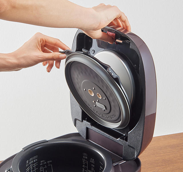 内ぶたには親水効果のある加工を採用。しずくになりにくく薄く膜を張ることで、加熱時には素早く蒸発し不要な水分を取り除き、保温時には水分の膜を張ってごはんをしっとり保温します。水滴になりにくいので、つゆだれも防ぎます。